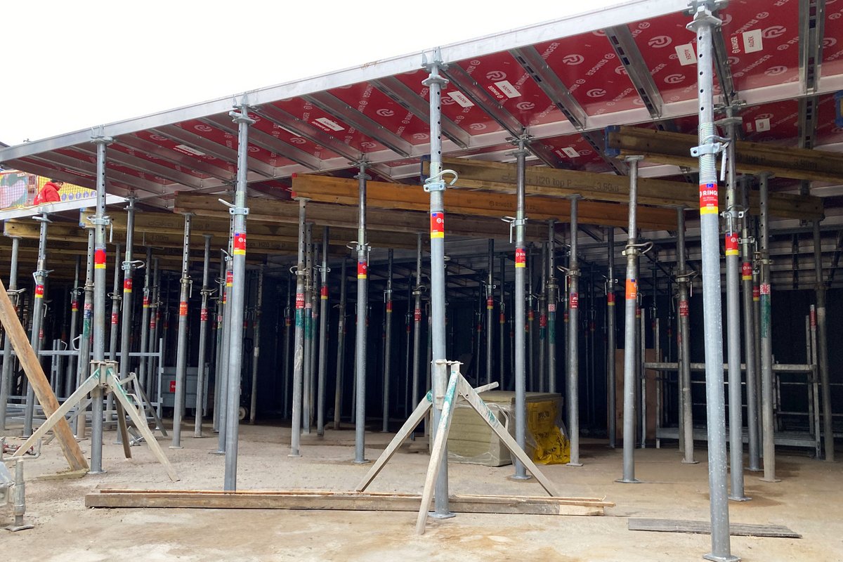 Verzinkte Deckensteher mit einer Tragkraft von 20kN und einer verstellbaren Länge zwischen 2,5m und 3,4m sorgten für die erforderliche Stützung der Deckenschalung. In Bereichen mit verstärkter Deckenbelastung (bis zu 48cm Dicke) wurde eine zusätzliche Unterstellung durch schräg positionierte H20 Träger für mehr Stabilität integriert.
