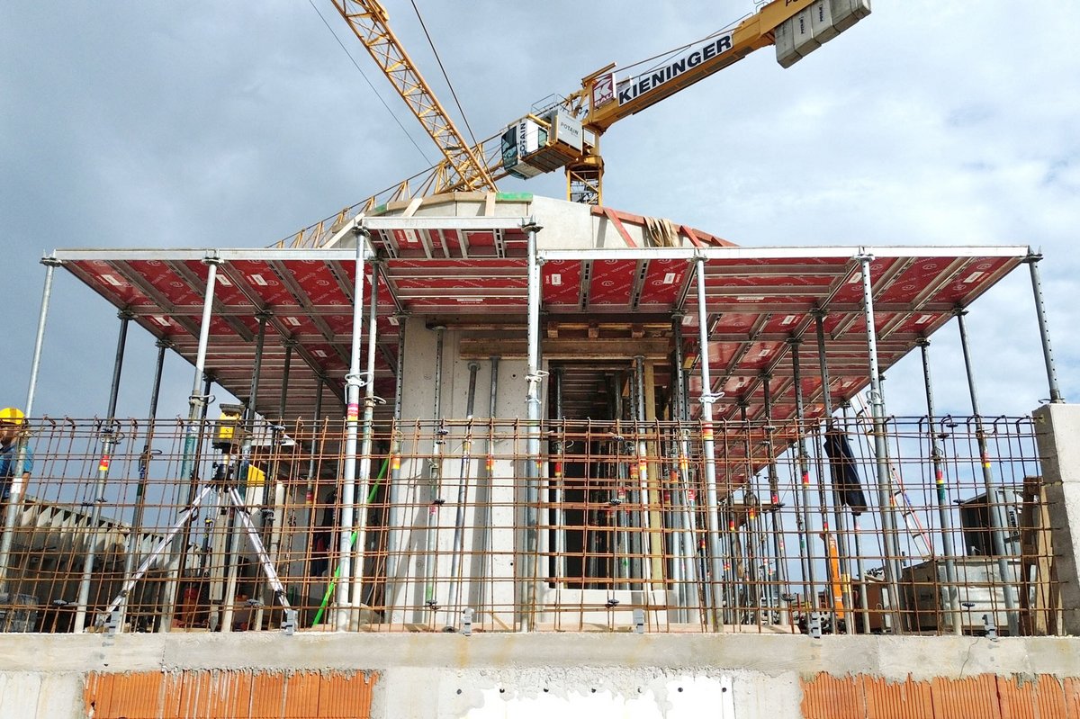 Zur Stabilisierung der einhäuptigen Master PRO Schalungselemente wurden Stützböcke der Größe „M“ verwendet, während die Betonierarbeiten durch in die Schalung eingehängte Betonierbühnen L vereinfacht wurden.