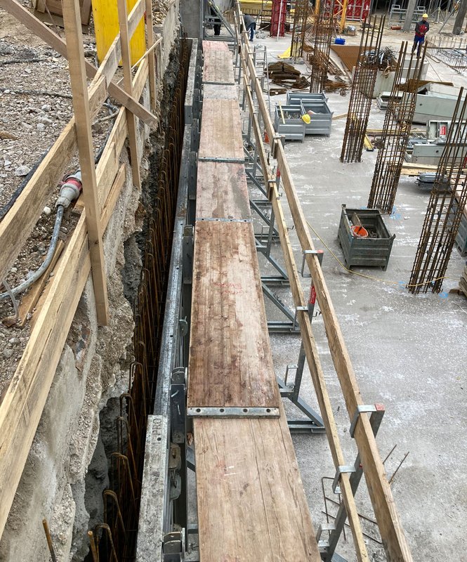 Aufgrund der besonders beengten Verhältnisse der Baugrube im städtischen Bereich wurden teilweise Spundwände entlang der Gebäudegrenze errichtet. Für die Schalungsarbeiten war somit eine einseitige Lösung erforderlich. Hier überzeugte die RINGER Master PROWandschalung, ausgestattet mit der hochwertigen und robusten alkus® Vollkunststoff-Schalhaut.