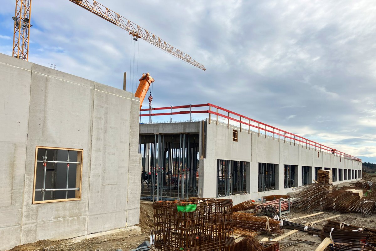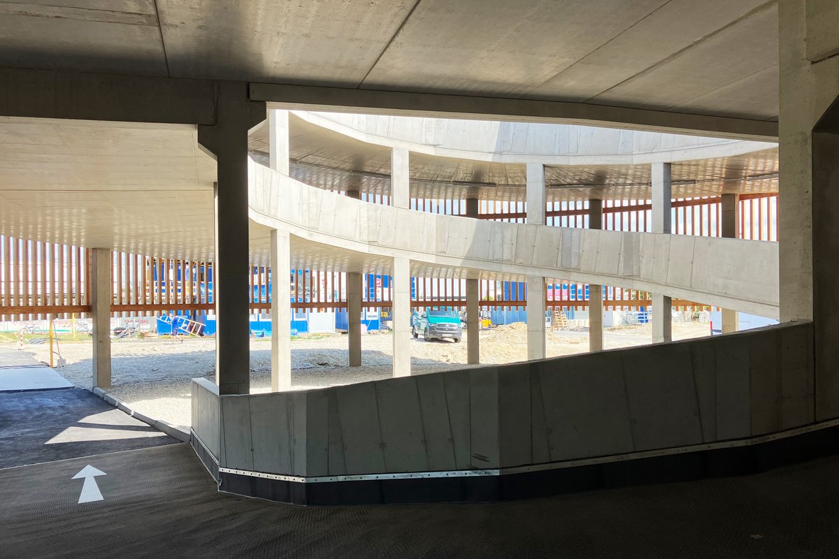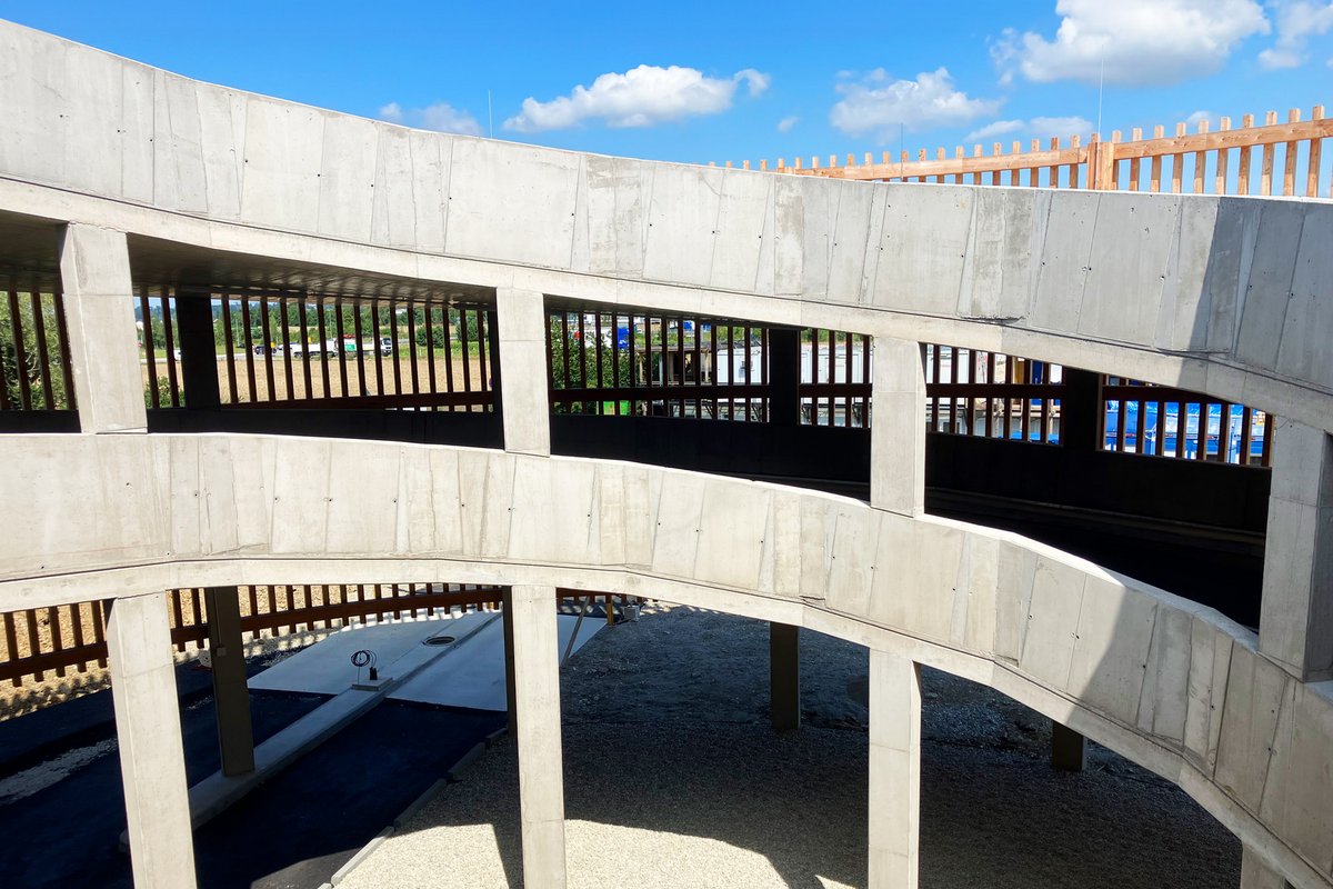 Bauteil 1, ein 4.800 m² großes Blocklager, wurde im 1. Obergeschoss durch ein Parkdeck ergänzt und bietet zusätzlich moderne Büroflächen. Der Verbindungsbau ermöglicht eine effiziente Anbindung an die bestehende Infrastruktur und sorgt für einen reibungslosen Ablauf der Logistikprozesse. Die Brüstung der polygonen Garagenabfahrt wurde mit der Alu Master Schalung und Schanierecken hergestellt.