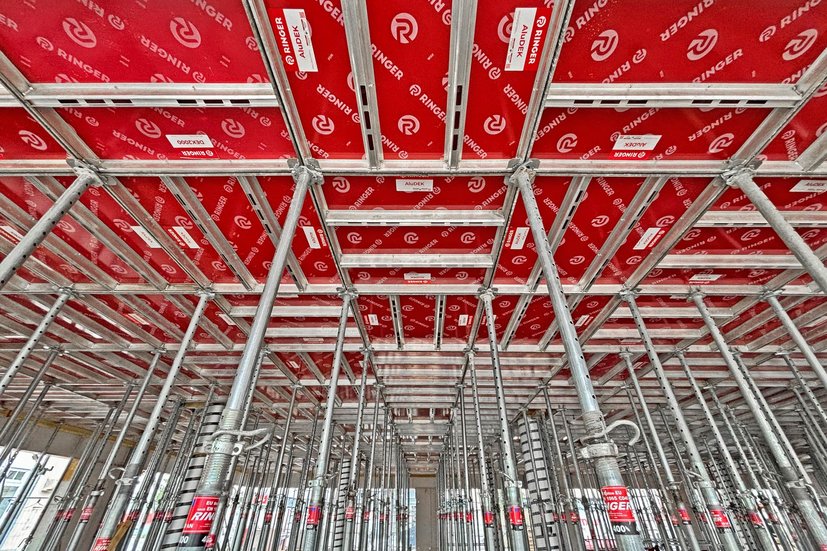 Die Deckenschalung wurde mit AluDEK 1,35/1,35er Elementen in Kombination mit 135/90er und 135/45er Paneelen umgesetzt. Die Moduldeckenschalung sorgte durch ihr geringes Gewicht und die einfache Handhabung nicht nur für hohe Schal(l)geschwindigkeit®, sondern ermöglichte auch kurzfristige Änderungen bei Wandinstallationen. Unterstützt wurde das System durch 20 kN Deckenstützen in 550er-Ausführung.