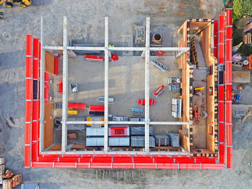 Für den Deckenvorsprung im Erdgeschoss wurde der DEKplus Deckentisch eingesetzt. Verwendet wurden dabei beide Tischgrößen: 5,40 x 2,25 m (12,15 m²) und 5,40 x 1,80 m (9,72 m²) in Kombination mit 20kN Stützen Bauhöhe 700. So ließ sich der Vorsprung mit einer zur Bauteilsituation passenden Tischlösung herstellen und zugleich effizient umsetzen.