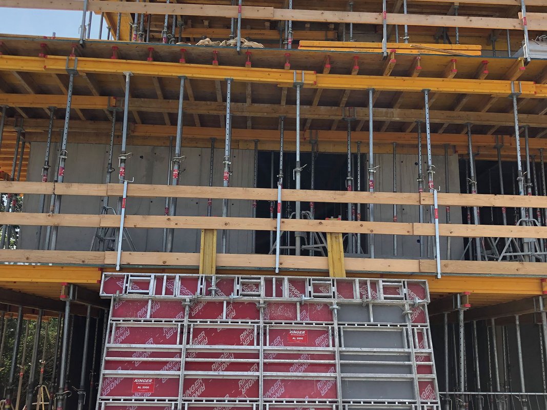 Die Baumeister Vogler GmbH wurde mit diesem Projekt beauftragt und greift auf die Decken- und Wandschalungslösungen von RINGER zurück. Für die Wände kamen die leichten Alu Elemente der Schalungssysteme AL2000 und Alu Master zum Einsatz. Für das Schalen der Decke vertraut man auf die bewährte Flex Schalung, welche ausreichend Flexibilität bei den Grundrissen bot. RINGER Seitenschutzgitter und Brüstungszwingen garantierten ein sicheres Arbeiten.