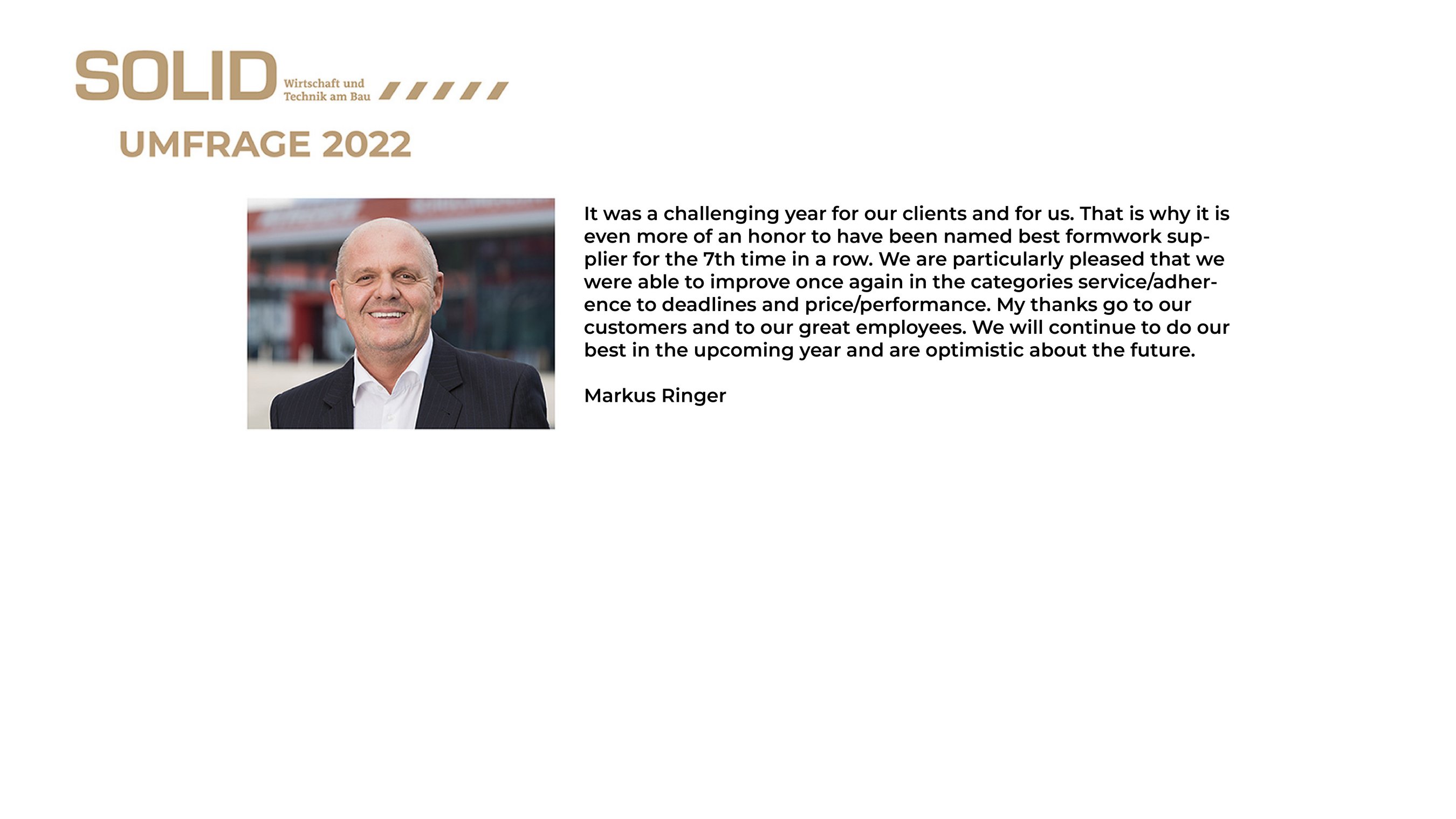 Seven in one sweep. This is how you could describe the result of this year's supplier ranking of the Austrian trade magazine SOLID. For the 7th time in a row, RINGER was able to win the prestigious ranking. In a comprehensive survey, customers were able to independently evaluate the partners on the market. The categories "price/performance", service/adherence to deadlines as well as product quality were available for selection. The bottom line was that RINGER once again achieved first place in the "Formwork" category and was thus able to successfully claim the title of "Best Formwork Supplier in Austria" again in 2022.