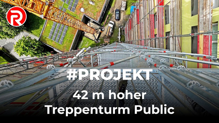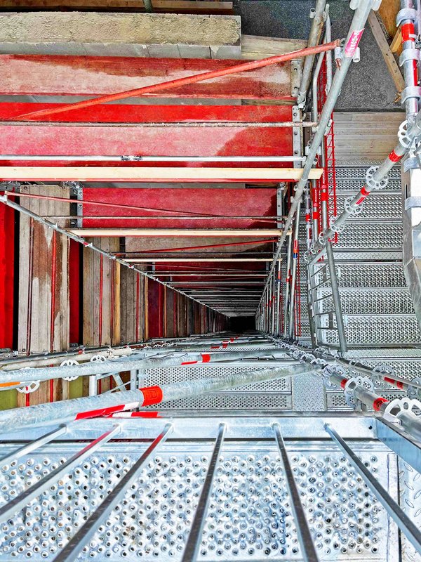 The scaffolding company Roman Mair & Söhne GmbH chose a 42 metre high scaffolding tower from RINGER as the solution. This served as a temporary staircase and met the required safety and comfort standards. The Public stair tower fulfils all the necessary regulations, including the standards applicable to public areas such as ÖNORM B5371 and OIB Guideline 4.