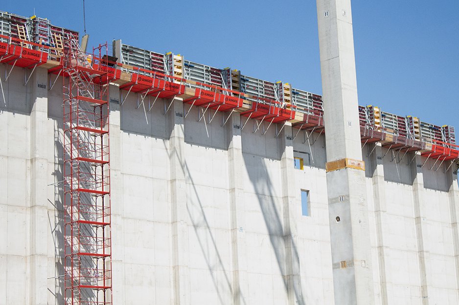 Within only two months, the shell consisting of foundation, columns and lateral walls was raised to a height of 28m. The executing company GERSTL BAU GmbH & Co KG relied on formwork and scaffolding solutions from RINGER. The length of one wall slab of the new building is 90 metres. The wall columns at intervals of approx. 5 metres, which were necessary for structural reasons, made the formwork work difficult. For a continuous construction process, the walls were divided into two cycles each, one concreting section thus amounts to 45m with a concreting height of approx. 310cm.