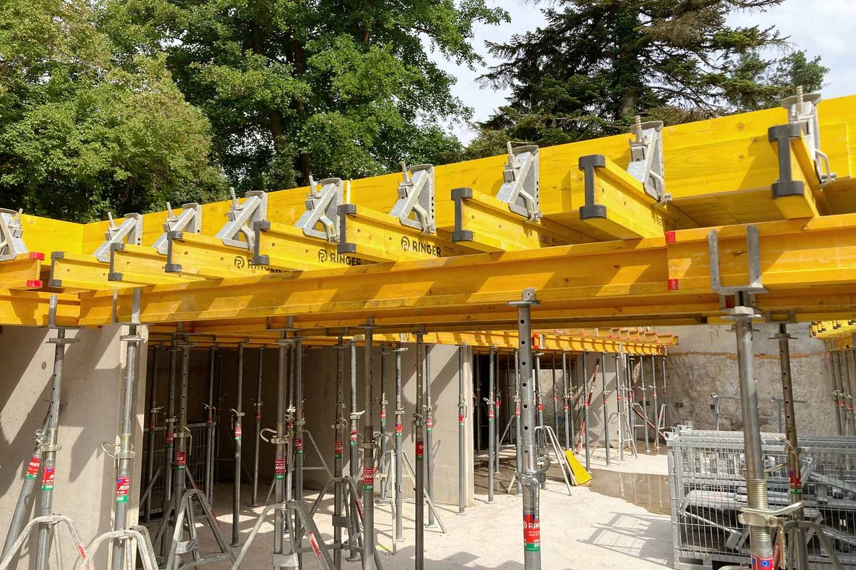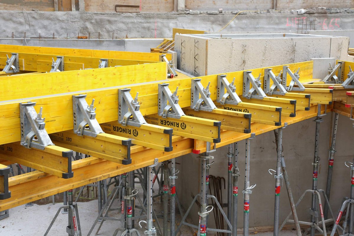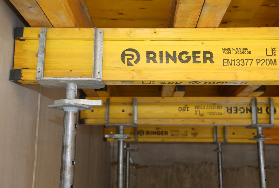 20 kN floor props with a maximum extension length of 250 cm, RINGER Fork Heads H20 and RINGER Lowering Heads H20 were used to stabilize the formwork beams.