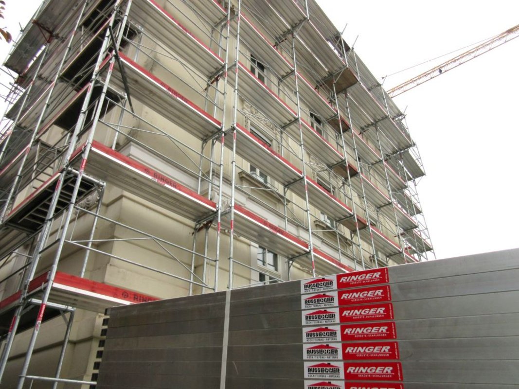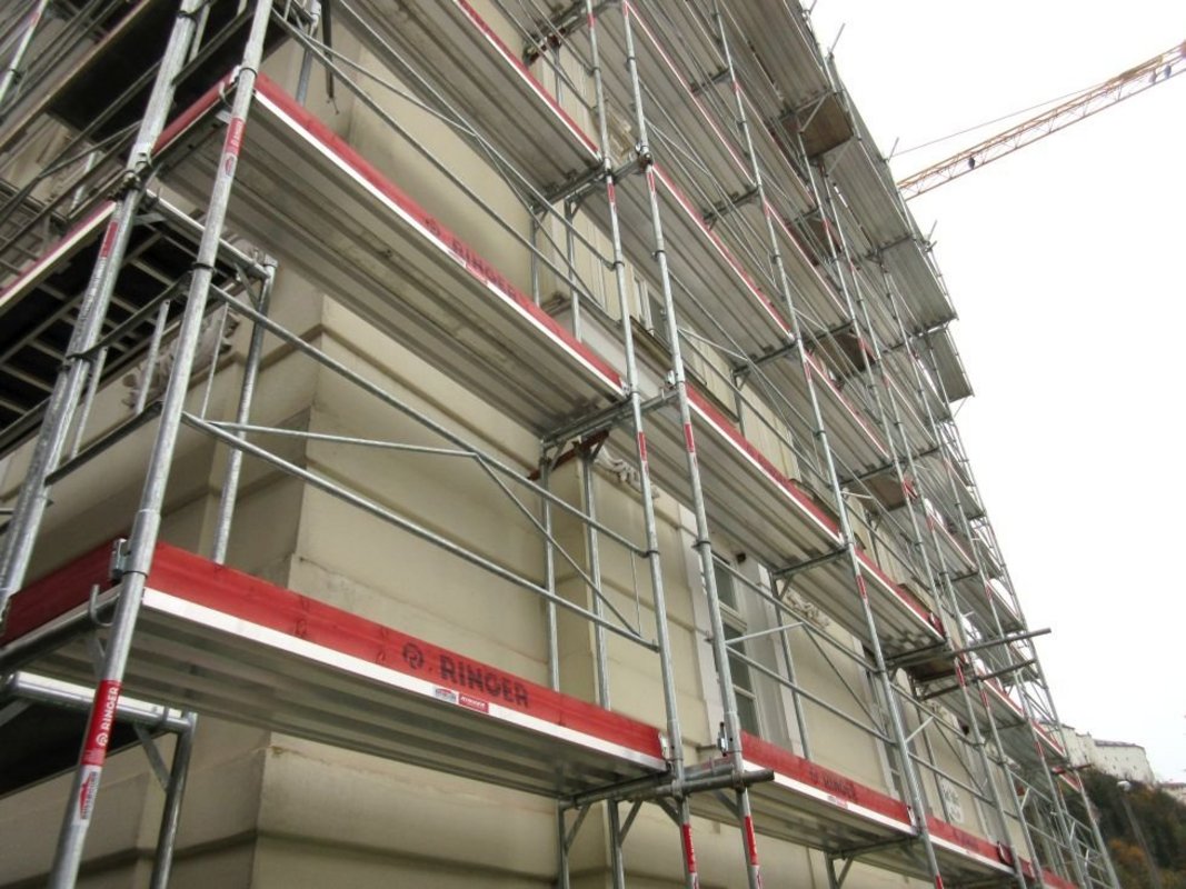 During the winter of 2021, up to 7,000m² of double railing scaffolding from RINGER will be in use. The fully galvanized steel frames can be set up in just a few simple steps and covered with platforms. RINGER ascent with flaps and ladders were used to move between floors safely. The main ascent was designed as a standard stair tower. Master builder Russegger and foreman Posch Manfred are enthusiastic. The lightweight aluminum platforms from RINGER are ideal for handling multi-storey scaffolding.