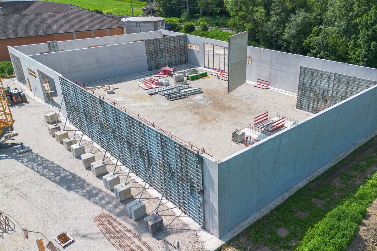 The walls of the hall were formed with the Master PRO steel frame formwork from RINGER, which can be operated from one side. Elements 3 m high in various widths were used. In order to speed up the construction process, panel assemblies were formed from four formwork panels each and moved further after each concreting process.