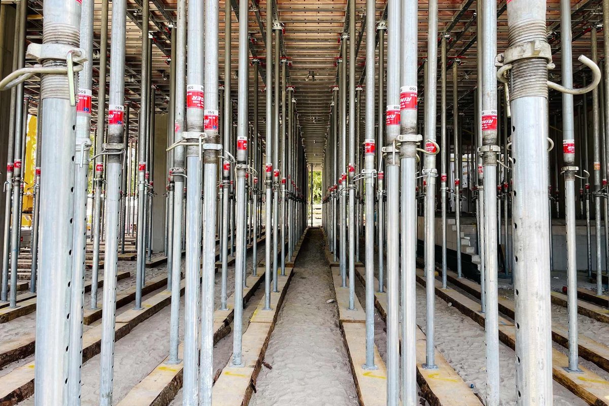 The resulting heavy weight was absorbed by up to eight floor props per DEKplus slab table. Thanks to the maximum flexibility of the connection points between the prop heads and the table, this posed no problem.