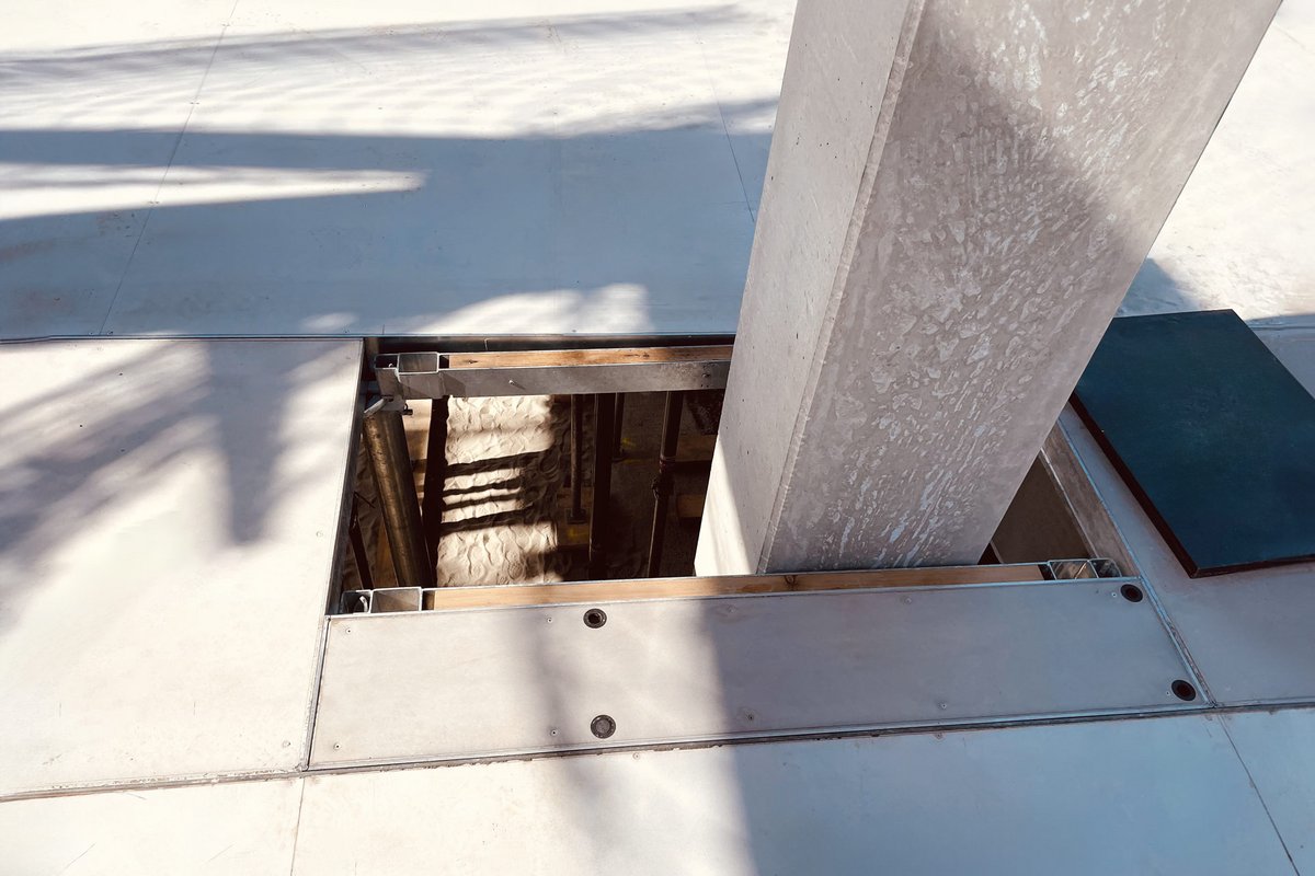 The slab construction of this part of the building is finally supported by 4 conical columns, which were moved in advance.