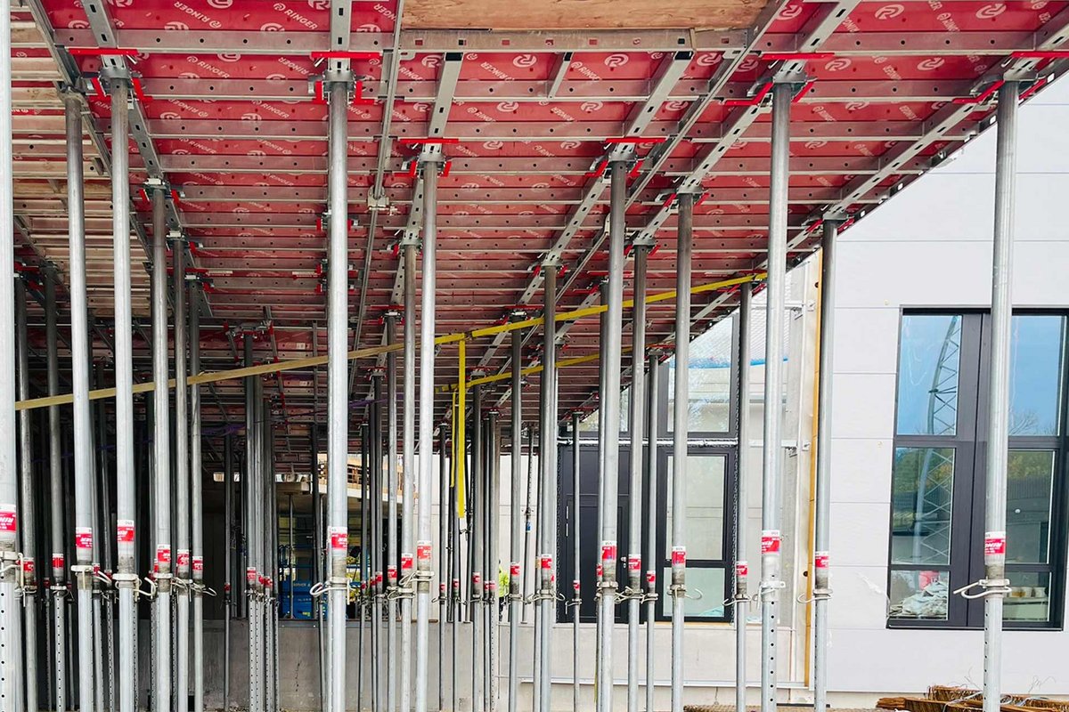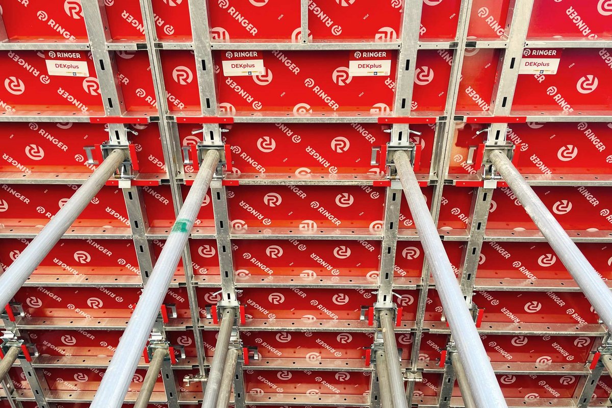 The large DEKplus panels measuring up to 540 x 225cm meant that particularly fast shuttering times were possible. Fitting areas were levelled out with AluDEK support rails, smaller AluDEK elements and formwork panels.