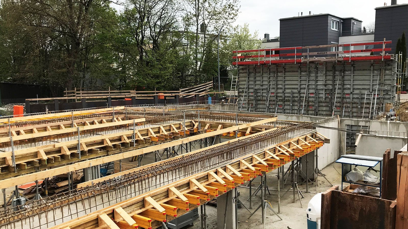 RINGER Super H20 beams were mainly used for forming the slabs. RINGER H20 beams are made of solid wood with glued full-wall wooden web and guarantee highest dimensional stability. The water-repellent color glaze and impact-resistant protective caps ensure a high number of reuse cycles. In total, there is a material value of RINGER products of approx. 500,000 Euros on this construction site.