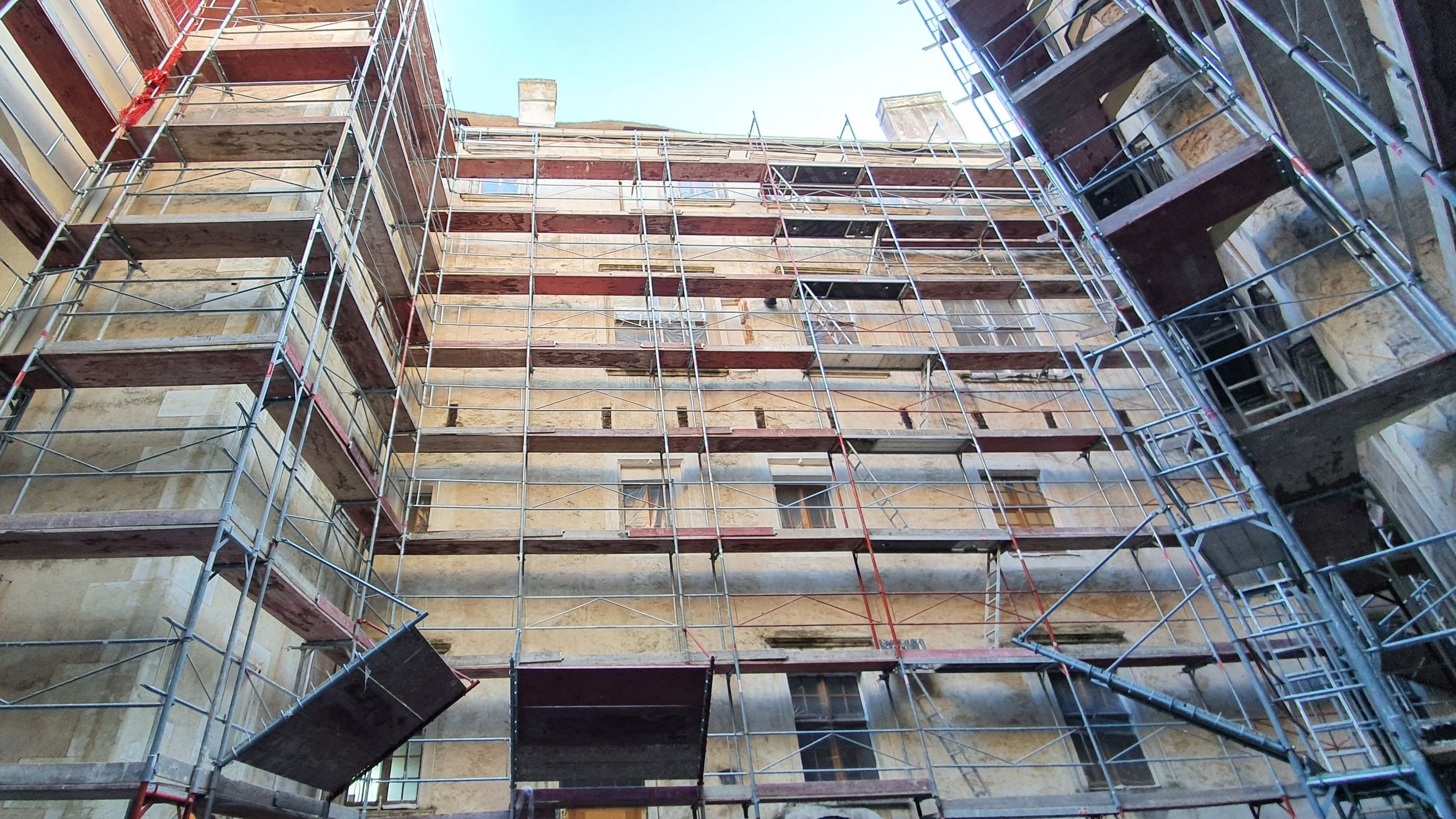 The ARGE Unideko - Heiling was commissioned with this great project and uses RINGER scaffolding solutions for the renovation work. Thanks to its quick assembly and its ability to adapt to any circumstances, the Double Railing Scaffolding speeds up construction progress. For the outside area, the RINGER Modular Scaffolding is used as a stair tower in order to be able to reach difficult areas and heights easily.
