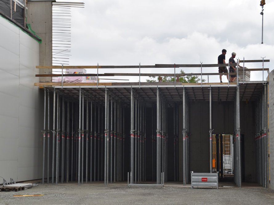 The central DEKplus slab formwork in the basement was constructed with the help of 23 pcs. (540*225cm) and a total formwork area of 280m². Around DEKplus and for the recesses on the columns, smaller AluDEK elements in different sizes (135*135cm, 135*90cm) were combined. Both systems have an identical construction height and are 100% compatible, which creates maximum flexibility. Smaller remaining areas were compensated with AluDEK support rails and formwork sheets. The entire upper floor was also largely formworked with AluDEK.