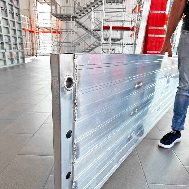 Well-thought-out details such as carrying handles, welded eyelets and drainage via the edge profile ensure maximum suitability for everyday use – ideal for double railing scaffolding and quick-assembly scaffolding.
