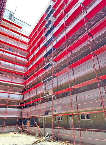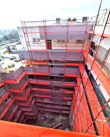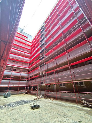 Poseban izazov predstavljali su unutarnji atriji - ograničen prostor, otežan pristup i visoki sigurnosni zahtjevi. Upravo u takvim uvjetima DG fasadna skela dolazi do punog izražaja: fleksibilna, stabilna i prilagodljiva, omogućila je sigurnu i učinkovitu izvedbu radova bez zastoja.