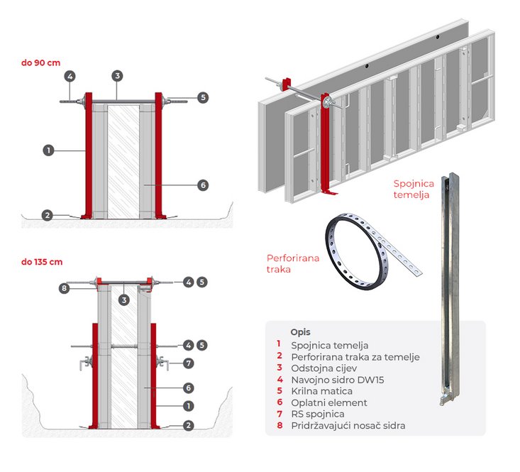 Za oplaćivanje temelja možete koristiti elemente oplate Sistem 2000 ili Master u vodoravnom položaju; sve što trebate je spojnica temelja i perforirana traka za temelje.