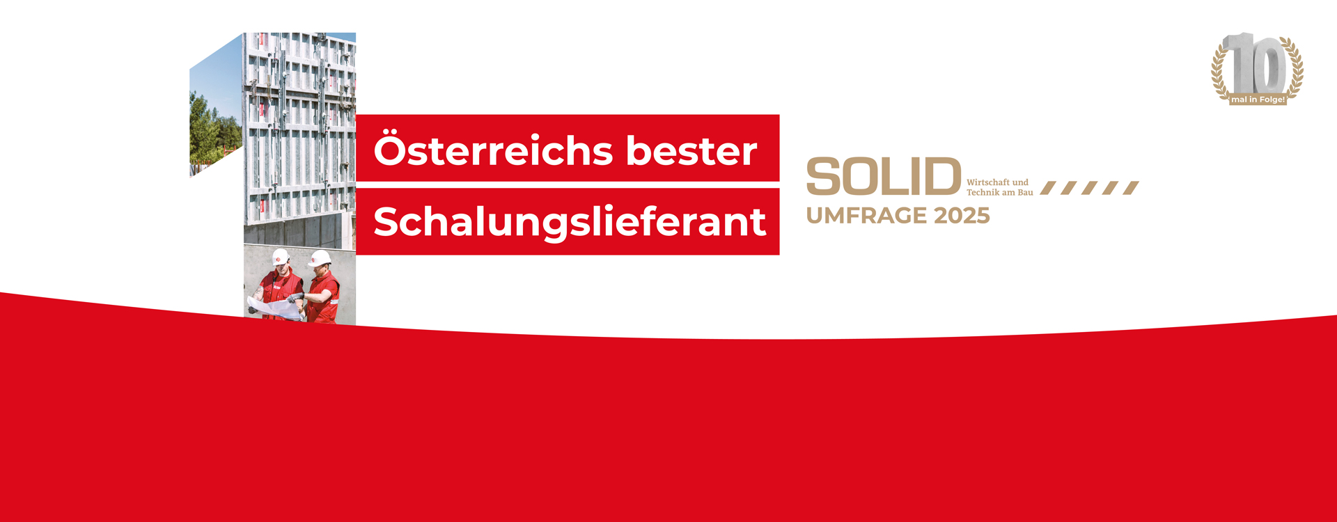 Tudi letos smo ponovno osvojili prvo mesto na lestvici »Najboljši dobavitelj opažev v Avstriji« strokovne revije SOLID. Takšne stvari se ne zgodijo vsak dan in niso samoumevne.