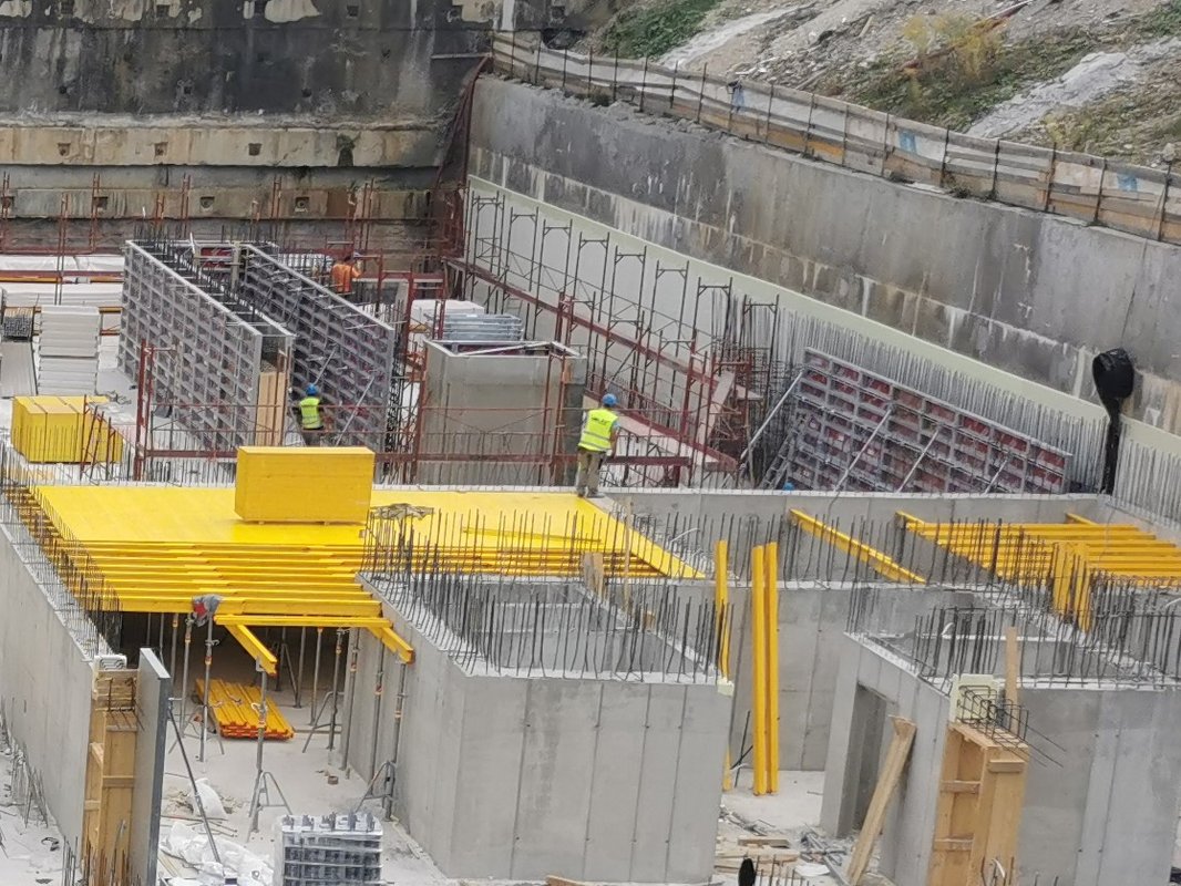 Uporabljena oprema: Enostranski opaž, Master, AluDEK, Flex, opažne mize, 3S konzolni odri in DG gradbeni oder